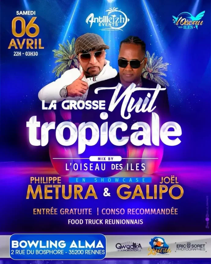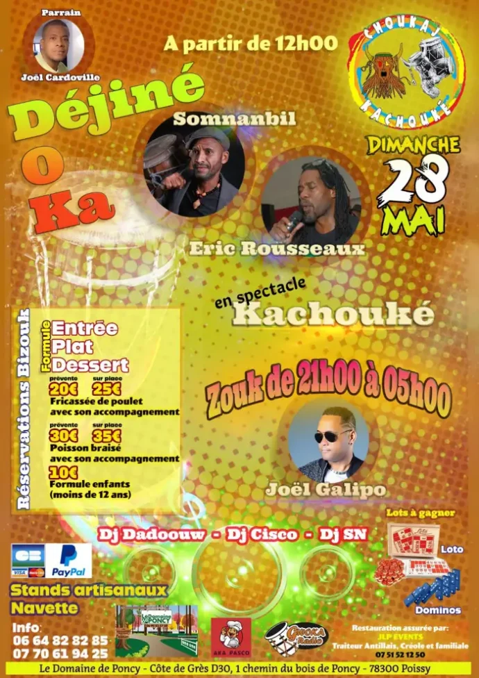 27 juin 2026 – 20h00 – 00h00 Au Bureau – 1 Rue Saint-Denis, 92700 Colombes voir 16 mai 2026 Club JMK – 277 Avenue Jean Jaurès, 93700 Drancy voir 6 mai 2026 Parc des expositions porte de Versailles, 75015 Paris voir 21 mars 2026 – 23h 3 chemin de Beville, 57530 Glatigny (Metz) voir 27 décembre 2025 – 22h à l'aube 89100 SENS voir 21 juin 2025 – 22h à l'aube Quartier la, Dumaine N, Le François 97240, Martinique voir 28 mai 2025 34 rue de l'ecouvier 95200 SARCELLES voir 4 mai 2025 – midi-minuit 111 rue Paul Vaillant couturier 95100 ARGENTEUIL voir 15 mars 2025 – 18:00 7 Av Marceau 93700 DRANCY voir 14 décembre 2024 – 20h30 Zéphyr Guyane voir 26 octobre 2024 – 12h00-00h00 Allée Henri Matisse à Villeneuve-Saint-Georges voir 31 août 2024 – 20h00 Dan's Lormont, Bordeaux voir 3 août 2024 – 22H00 L’Espace l’Arpentiere 3 square Flora Tristan 77680 Roissy en Brie voir 6 juillet 2024 – 11h00 – 21h00 93440 DUGNY voir 22 juin 2024 – 16h00 Parc de la mairie Margency voir 21 juin 2024 – 20H00 ESPACE MOZAIK 11 rue Maximilien Robespierre, 93130 Noisy le sec voir 26 mai 2024 – 13h00 Paris voir 18 mai 2024 – 16h00 aux Étangs-chauds, au Mans (Sarthe) voir 3 mai 2024 5 rue marcel Serdan 95140 GARGES LES GONESSES voir 6 avril 2024 – 22h 2 rue du BOSPHORE 35200 RENNES voir 30 mars 2024 – 16h00 Paris voir 26 mars 2024 – 11h00 Paris voir 18 novembre 2023 – 20h 5 rue de la pompadour 94470 BOISSY ST LEGER voir 19 août 2023 – 12H00 RUE DU BASSIN 95190 GOUSAINVILLE voir 22 juillet 2023 – 11H – 20H Domaine de PONCY 78300 POISSY voir 16 juillet 2023 – 12H – 22H Le 14, tiers -lieu artistique, culturel et solidaire 8144 rue du débarcadère, colombes voir 23 juin 2023 – 19H MARTINIQUE voir 22 juin 2023 – 11 H MARTINIQUE voir 18 juin 2023 – 13 H ANGERS voir 4 juin 2023 – 12H-19H La maison de quartier les vignes blanche 95200 SARCELLE voir 28 mai 2023 – 21h00 DOMAINE DE PONCY 7800 POISSY voir 27 mai 2023 – 23H À L'OASIS BOBIGNY 2, rue du Vieux chemin de Saint-Denis, 93000 BOBIGNY voir 29 avril 2023 – 18h GUADELOUPE voir